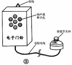 实际使用时,将门铃小盒挂在室内墙壁上或者门扇背后,按钮开关SB则通过双股软塑电线引至房门外,在门框的适当位置(一般距地面1.5~1.7m左右)处固定。这样,当客人来访时,按下门口的按钮开关,室内门铃即会发出响亮的“嘟——”声,告诉主人:“有客人来了!”